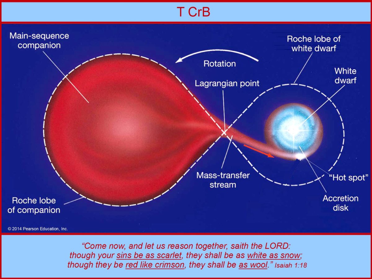 The Red Giant symbolizing our sins and His blood. And the white dwarf symbolizing the LORD taking our sins. The earth-size white dwarf slowly strips hydrogen away from the red giant. When enough hydrogen accumulates on the white dwarf, the growing pressure and heat triggers a thermonuclear blast visible from Earth.