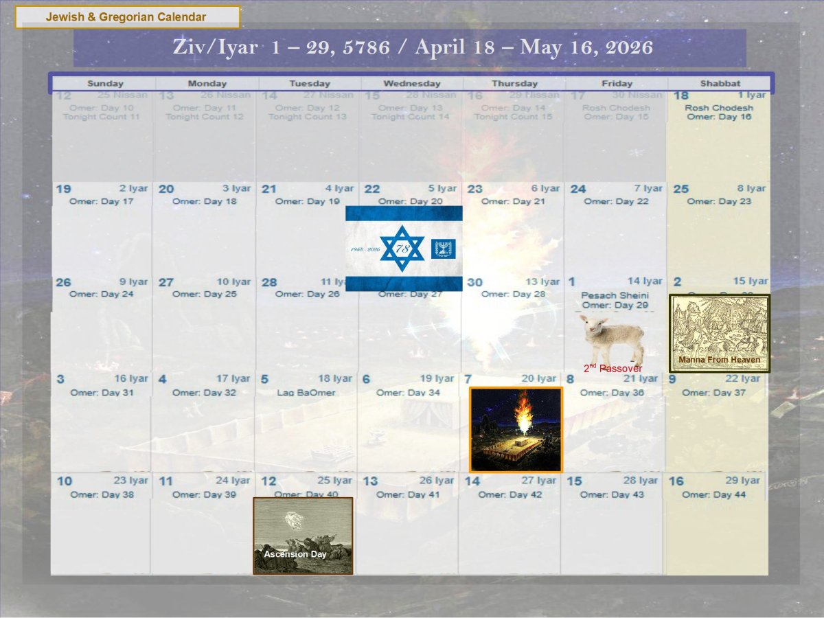 - 15 Ziv ~ Manna (bread) falls from heaven 30 days after exodus from Egypt. [5]